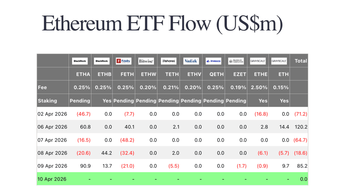 Monday started the week on firmer footing for spot ether ETFs, with $120.2 million in net inflows led by BlackRock's ETHA at $60.8 million and Fidelity's FETH at $40.1 million, with smaller contributions from Grayscale's ETH and 21Shares' TETH. Tuesday reversed sharply into $64.7 million of net outflows, driven mainly by FETH at negative $48.2 million and ETHA at negative $16.5 million. The weakest midweek day was Wednesday at negative $18.6 million, while Thursday was the strongest remaining session with $85.2 million in inflows led by ETHA at $90.9 million, partially offset by outflows from FETH, TETH, EZET, and ETHE. Overall, ether ETFs were more mixed than Monday first suggested, but the group still closed the week with a modest positive net balance across the main trading days.