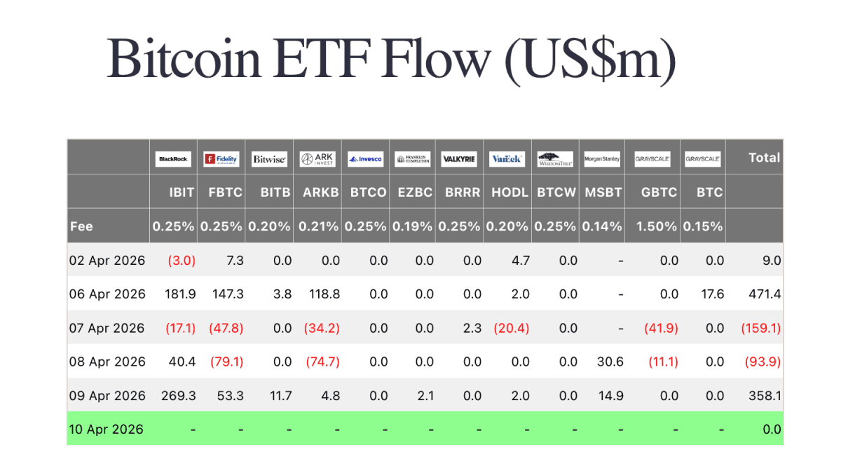 Monday brought a strong rebound in spot bitcoin ETF demand, with total net inflows of $471.4 million led by BlackRock's IBIT at $181.9 million, Fidelity's FBTC at $147.3 million, and ARKB at $118.8 million. Tuesday then flipped into outflows, with the group losing $159.1 million as FBTC, GBTC, ARKB, HODL, and IBIT all finished negative on the day. The weakest midweek session came Wednesday at negative $93.9 million, but Thursday was the strongest of the remaining sessions with $358.1 million in net inflows, again led by IBIT at $269.3 million and FBTC at $53.3 million. Overall, bitcoin ETFs stayed choppy through the week but still finished the Monday-through-Thursday stretch with solid net inflows as institutional demand returned on the stronger days.