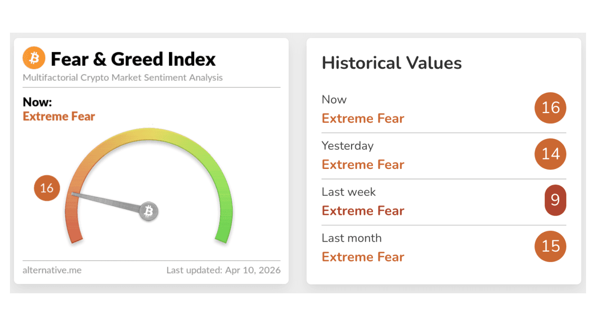 Crypto markets recovered this week as broader risk appetite improved on hopes that U.S.-Iran tensions might ease, helping bitcoin and ether move higher alongside other risk assets. Even so, the tone stayed cautious as the ceasefire narrative remained shaky and energy-market uncertainty continued to hang over macro sentiment. That caution showed up clearly in the Fear & Greed Index, which stood at 16 on April 10, up from 14 the day before and 9 a week earlier, but still firmly in Extreme Fear. For Metal Pay users, the takeaway is that price action improved, but conviction still looks thin and the market has not fully moved out of defensive mode.