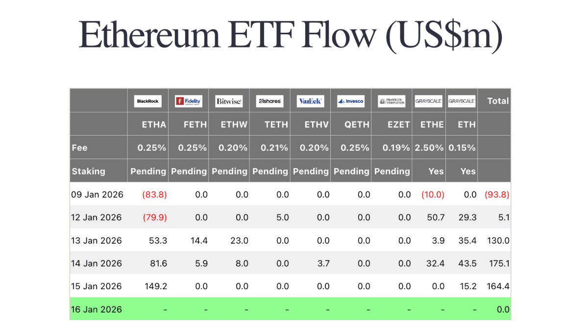 Ethereum spot ETFs opened the week with a modest $5.1m net inflow on Monday as Grayscale’s ETHE (+$50.7m) and Grayscale’s ETH (+$29.3m) outweighed a large BlackRock ETHA outflow (-$79.9m). Tuesday strengthened to $130.0m of net inflows, led by ETHA (+$53.3m) and Grayscale’s ETH (+$35.4m) with additional support from Bitwise’s ETHW (+$23.0m). The biggest midweek day was Wednesday at $175.1m as ETHA (+$81.6m) and Grayscale’s ETH (+$43.5m) led, while Thursday remained firm at $164.4m driven primarily by ETHA (+$149.2m). Overall, flows improved materially versus last Friday’s -$93.8m, with three consecutive inflow days signaling steadier demand through the week.