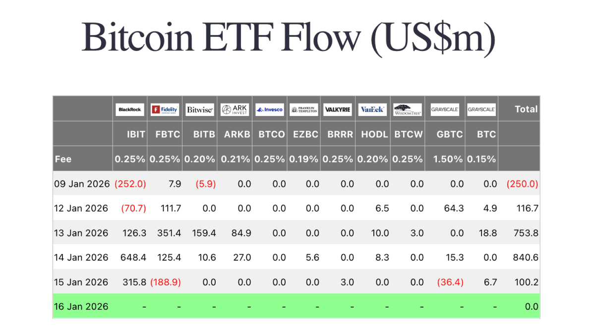 Bitcoin spot ETFs started the week with net inflows of $116.7m on Monday, led by Fidelity’s FBTC (+$111.7m) and Grayscale’s GBTC (+$64.3m), while BlackRock’s IBIT saw -$70.7m. Tuesday accelerated with $753.8m of net inflows, paced by FBTC (+$351.4m) and IBIT (+$126.3m) alongside strength in Bitwise’s BITB (+$159.4m). The strongest day midweek was Wednesday at $840.6m as IBIT dominated (+$648.4m), while Thursday cooled to $100.2m as IBIT inflows (+$315.8m) were partly offset by FBTC outflows (-$188.9m) and GBTC (-$36.4m). Overall, flows swung sharply higher after last Friday’s -$250.0m, with strong midweek demand driving a net-positive run into the end of the snapshot.