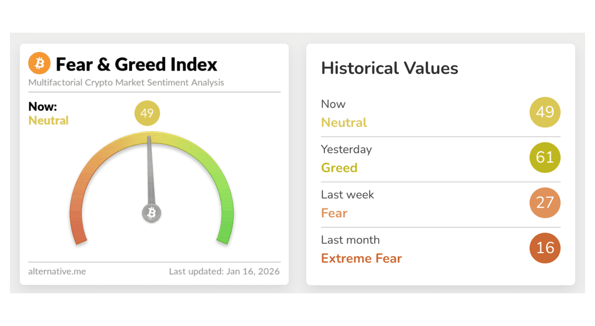 Crypto market sentiment has moved back into Neutral (49) for the first time in roughly a month, marking a notable shift from the extreme fear conditions seen in December. Just days ago the index briefly touched Greed (61), while last week it sat at Fear (27) and last month at Extreme Fear (16). The return to neutral suggests selling pressure has eased and positioning is becoming more balanced, with neither panic nor euphoria dominating market behavior. Historically, neutral readings often appear during consolidation phases, where markets digest prior volatility before choosing a clearer directional trend. In this context, sentiment stabilization aligns with improving ETF flows and steadier price action across major assets.