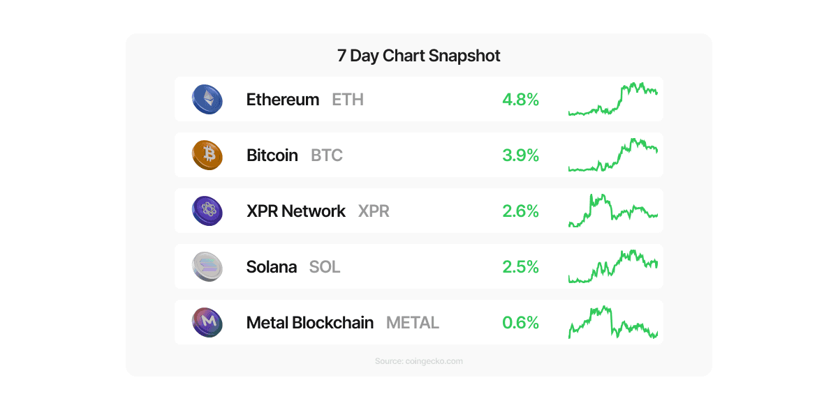 Ethereum (ETH) led Metal Pay’s 7-day gainers, rising 4.8% and slightly outpacing Bitcoin’s 3.9% move as spot ETF demand for both assets improved midweek. XPR Network (XPR) added 2.6% and Solana (SOL) gained 2.5%, extending the week’s risk-on tone across large-cap alt exposure. Metal Blockchain (METAL) was up 0.6%, holding a small edge into the weekly close. In the background, stablecoin policy debates in Washington and continued institutional focus on stablecoin settlement kept attention on the “rails” side of crypto, while ETF flow strength helped support majors.