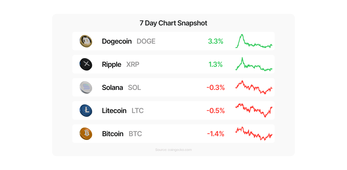 Dogecoin (DOGE) led the weekly snapshot, rising 3.3% and standing out as one of the few clear positives during a cautious week. XRP also remained in the green (+1.3%), while Solana (-0.3%), Litecoin (-0.5%), and Bitcoin (-1.4%) posted only modest pullbacks. In a broader tape marked by extreme fear, these larger-cap names largely absorbed volatility rather than breaking down, suggesting rotation favored liquidity and established assets over speculative outperformance.