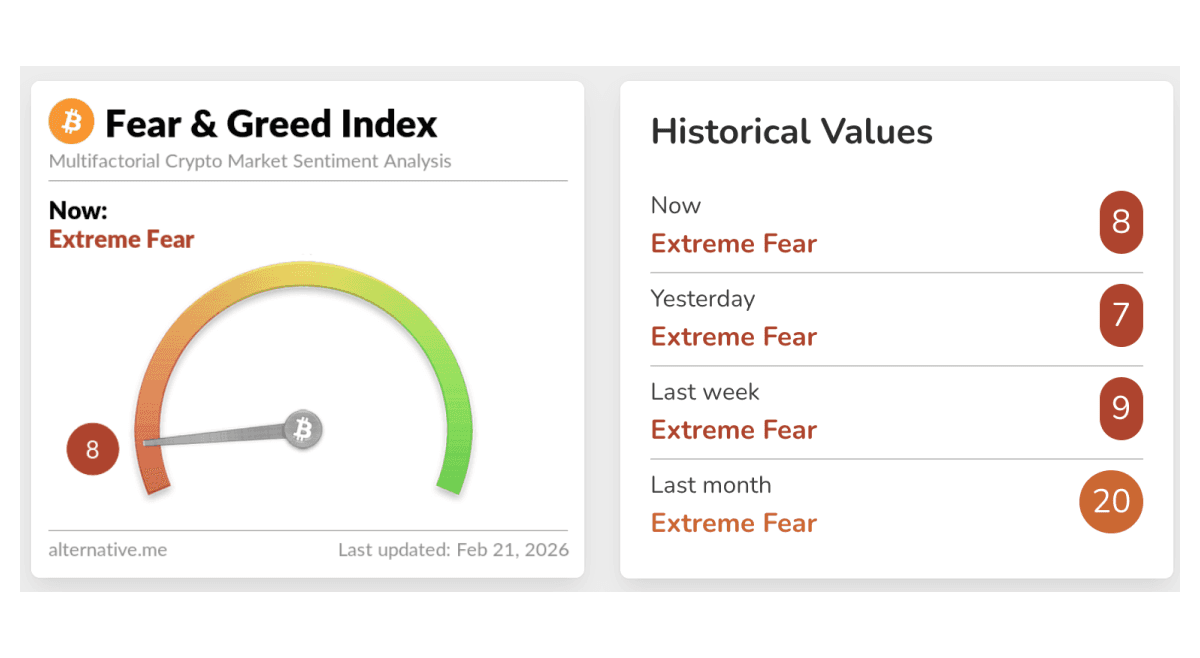 Crypto sentiment remained pinned in “Extreme Fear” this week, with the Fear & Greed Index reading 8 (vs. 9 last week), underscoring how cautious positioning still is after the recent shakeout. In broader markets, investors continued to parse mixed U.S. data and shifting risk appetite, with bitcoin and other majors moving alongside wider macro headlines rather than on a single crypto-specific catalyst. The gap between mood and price action stayed notable: even modest rebounds are being met with skepticism, and flows have been choppy. For everyday investors, the setup reads less like euphoria and more like a market still trying to find stable footing.