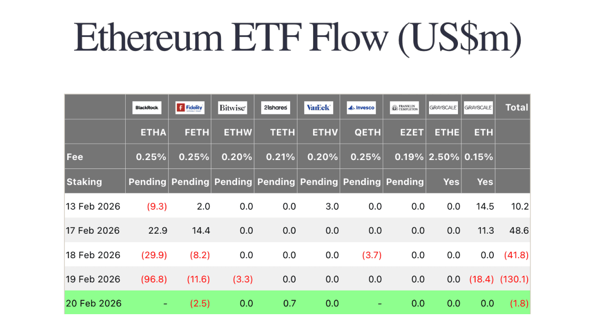 With Monday closed for the U.S. holiday, Tuesday began with $48.6m of net inflows, led by BlackRock’s ETHA (+$22.9m), Fidelity’s FETH (+$14.4m), and Grayscale’s ETH (+$11.3m). Wednesday reversed lower with $41.8m of net outflows, as ETHA (-$29.9m) and FETH (-$8.2m) drove redemptions. The weakest session was Thursday at $130.1m in net outflows, dominated by ETHA (-$96.8m) alongside additional FETH and Grayscale ETH selling. Friday flows were nearly flat but slightly negative at -$1.8m. Overall, ETH ETFs followed a similar midweek risk-off pattern after a strong start.