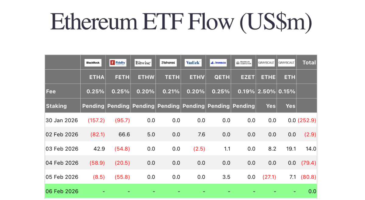 Monday was effectively flat with a small $2.9m net outflow, as BlackRock’s ETHA (-$82.1m) was mostly offset by Fidelity’s FETH (+$66.6m) plus smaller inflows in Bitwise’s ETHW (+$5.0m) and VanEck’s ETHV (+$7.6m). Tuesday improved to $14.0m of net inflows, helped by ETHA (+$42.9m) and Grayscale’s ETH (+$19.1m), even as FETH (-$54.8m) pulled back. Midweek was weakest on Wednesday with $79.4m of net outflows, led by ETHA (-$58.9m) and FETH (-$20.5m). Thursday stayed soft at $80.8m of net outflows as FETH (-$55.8m) and Grayscale’s ETHE (-$27.1m) outweighed modest positives in ETH (+$7.1m) and Invesco’s QETH (+$3.5m). Overall, ETH ETF flows tracked the broader risk-off tone, with only a brief positive pocket on Tuesday.
