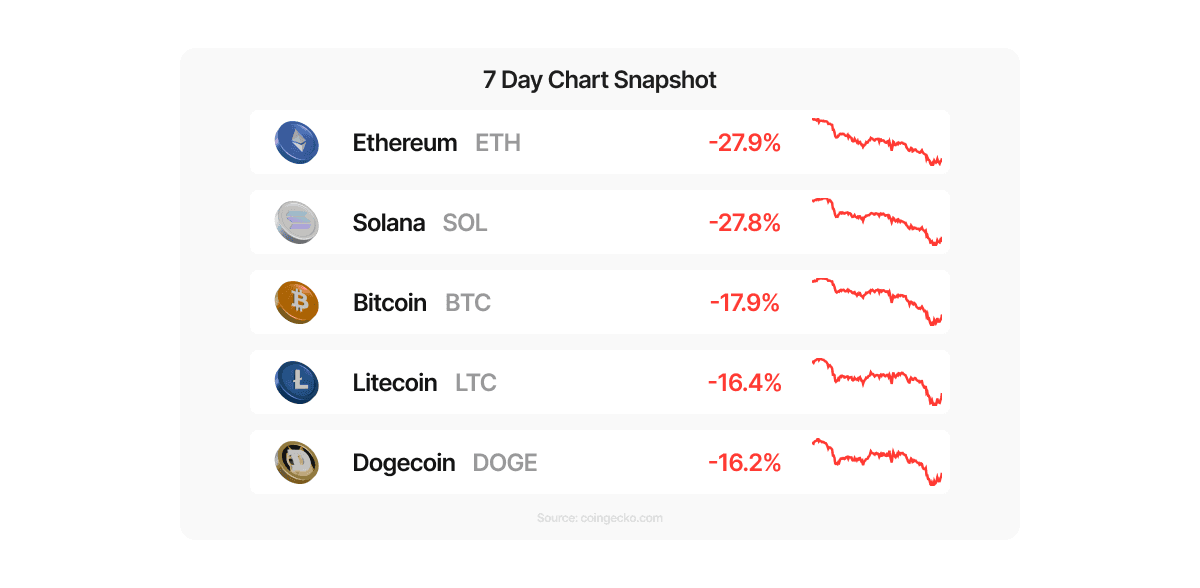 Crypto markets suffered a broad and aggressive selloff this week, with major assets posting their steepest losses since late 2022 as investors moved decisively into risk-off mode. Bitcoin fell nearly 18% over seven days, while Ethereum and Solana each dropped close to 28%, pressured by a combination of macro uncertainty, heavy liquidations, and sustained ETF outflows. Reuters and CoinDesk reported that U.S. spot Bitcoin ETFs saw renewed net redemptions, removing a key source of institutional support just as prices broke below critical technical levels. Analysts also pointed to forced unwinds of leveraged positions, which accelerated downside momentum once support zones failed. The pullback pushed the Crypto Fear & Greed Index into “Extreme Fear,” highlighting a sharp reset in sentiment as traders step back to reassess positioning amid heightened volatility.
