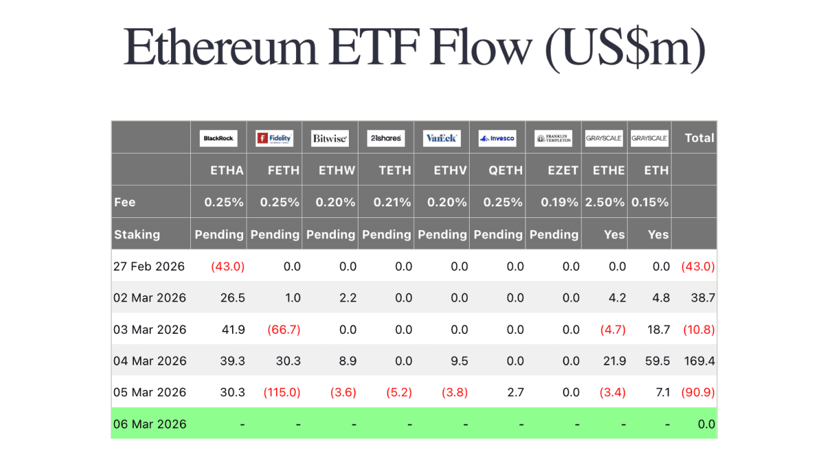 On Monday, U.S. spot Ethereum ETFs recorded $38.7 million in net inflows, led by BlackRock’s ETHA at $26.5 million with smaller support from Grayscale’s ETH and ETHE. Tuesday flipped to a modest $10.8 million in net outflows, as a $66.7 million withdrawal from Fidelity’s FETH outweighed inflows into ETHA and ETH. Wednesday was the strongest day of the week by far at $169.4 million, powered by Grayscale’s ETH at $59.5 million, ETHA at $39.3 million and FETH at $30.3 million. The previous Friday had seen $43.0 million in net outflows, entirely from ETHA. Overall, Ethereum ETF demand was more uneven than bitcoin this week, with a strong midweek surge giving way to Thursday outflows of $90.9 million led by FETH.
