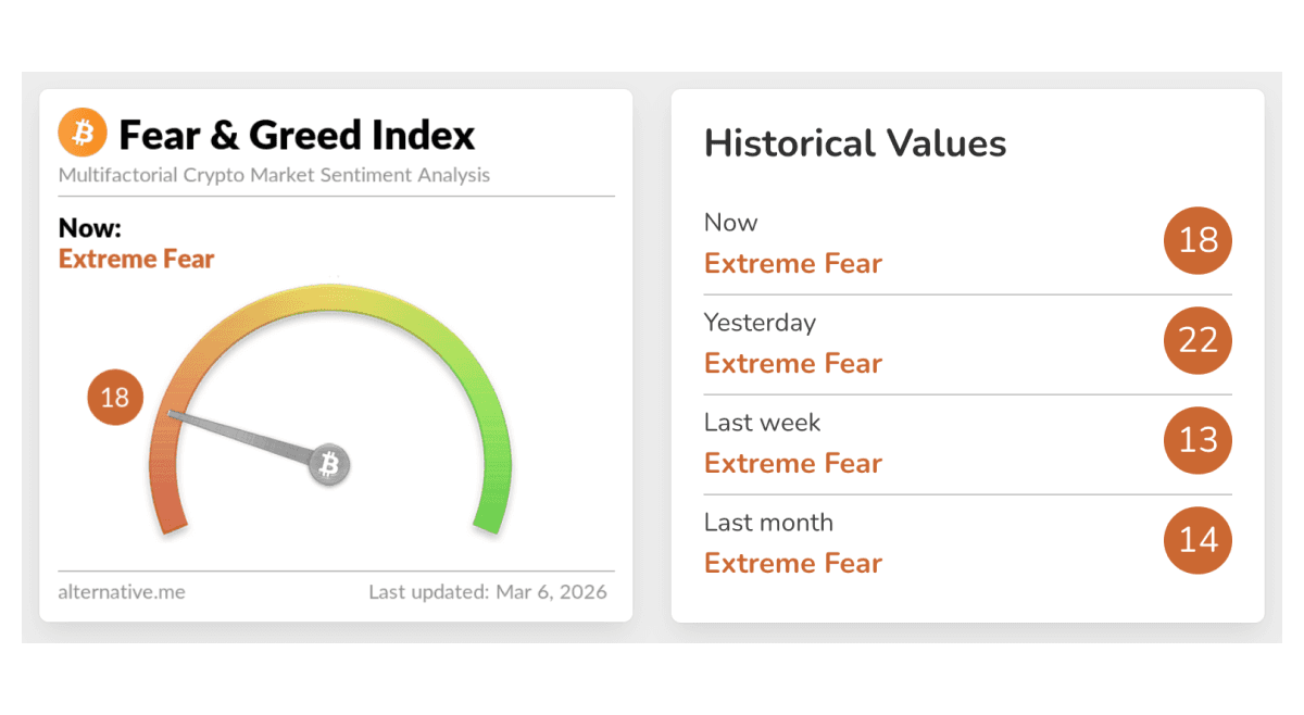 Crypto markets found some footing this week as risk appetite improved midweek, helped by a pause in oil’s surge and hopes that geopolitical tensions might not escalate further. On March 4 bitcoin rose 7.64% to about $73,245 while ether gained 9.23% to roughly $2,150, giving the market a relief bounce after a rough stretch. Even so, sentiment remains cautious rather than euphoric. The Crypto Fear & Greed Index was still sitting in Extreme Fear at 18 on March 6, up from 13 a week earlier but still well below neutral, suggesting traders are buying the bounce carefully rather than chasing aggressively.
