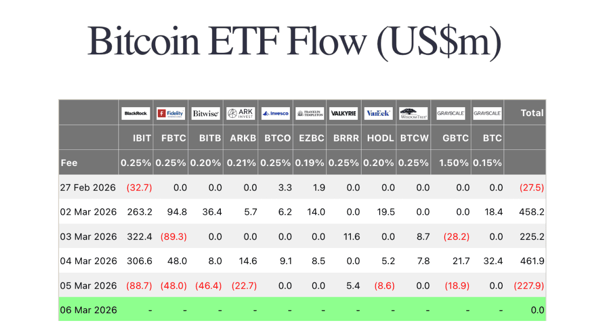 On Monday, U.S. spot Bitcoin ETFs posted a strong $458.2 million in net inflows, led by BlackRock’s IBIT at $263.2 million and Fidelity’s FBTC at $94.8 million. Tuesday stayed positive at $225.2 million, with IBIT bringing in $322.4 million while outflows from FBTC and GBTC partially offset the day’s total. Wednesday was the strongest session of the week at $461.9 million, again driven by IBIT with $306.6 million, alongside contributions from FBTC, BTC and GBTC. The previous Friday had been softer, with $27.5 million in net outflows as IBIT losses outweighed small inflows into BTCO and EZBC. Overall, Bitcoin ETF flows showed real demand earlier in the week before reversing sharply on Thursday with $227.9 million in net outflows led by IBIT, FBTC and BITB.