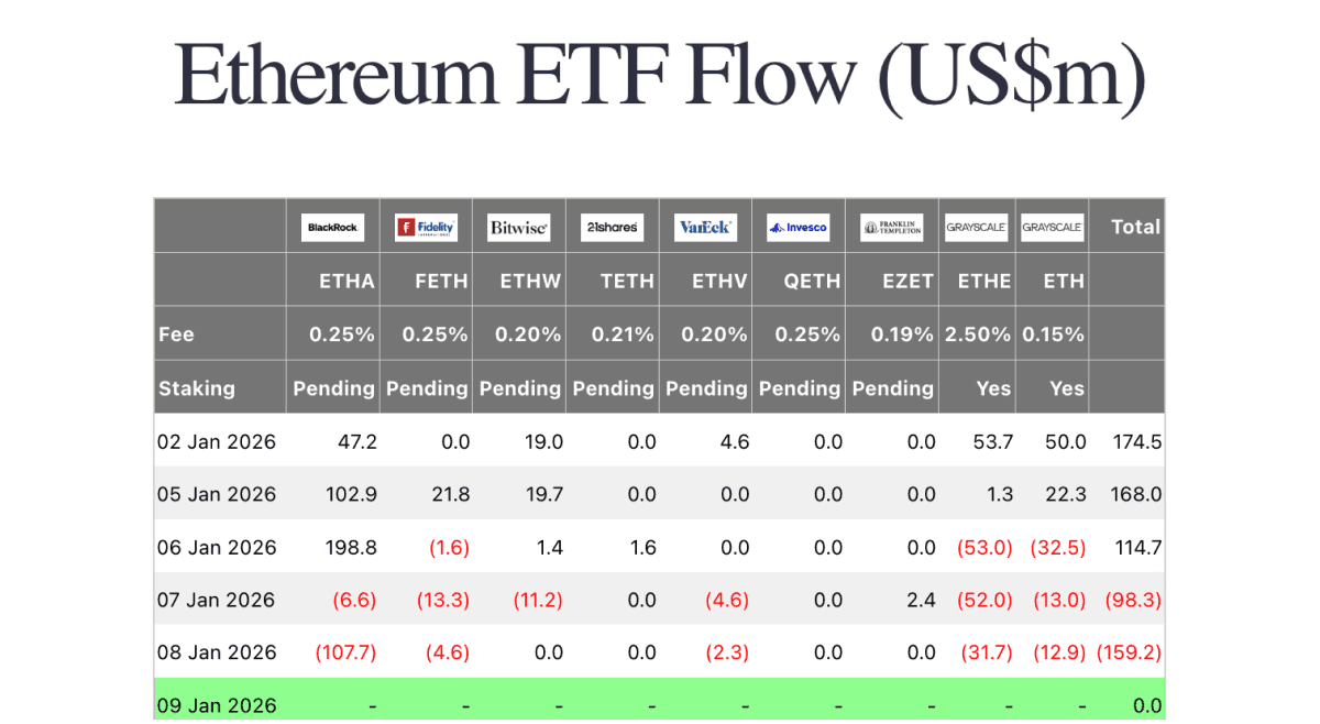 On Monday, spot Ethereum ETFs brought in $168.0m, led by BlackRock’s ETHA (+$102.9m) with support from Fidelity’s FETH (+$21.8m) and Grayscale’s ETH (+$22.3m). Tuesday remained positive at +$114.7m, but flows were more mixed as ETHA (+$198.8m) offset sizeable outflows from Grayscale’s ETHE (−$53.0m) and ETH (−$32.5m). The strongest/weakest midweek swing came as Wednesday turned to −$98.3m, led by ETHE (−$52.0m) with additional redemptions across FETH and ETHW. Outflows accelerated Thursday to −$159.2m, driven primarily by ETHA (−$107.7m) alongside ETHE (−$31.7m) and ETH (−$12.9m). Overall, ETH ETF flows stayed net positive for the broader window shown thanks to large ETHA creations early in the week, even as Grayscale products saw consistent pressure into the back half.