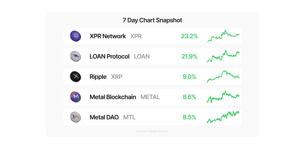 XPR Network (XPR) led the pack this week, up +23.2%, with LOAN Protocol (LOAN) close behind at +21.9% as smaller-cap names outperformed during a choppy macro-driven tape. Ripple (XRP) still posted a solid +9.0% week, extending its early-2026 momentum as investors continue to focus on product-driven demand and broader market narratives around XRP investment vehicles. Metal Blockchain (METAL) gained +8.6% and Metal DAO (MTL) rose +8.5%, tracking the broader rotation into altcoins that showed relative strength even as ETF flows turned volatile midweek.