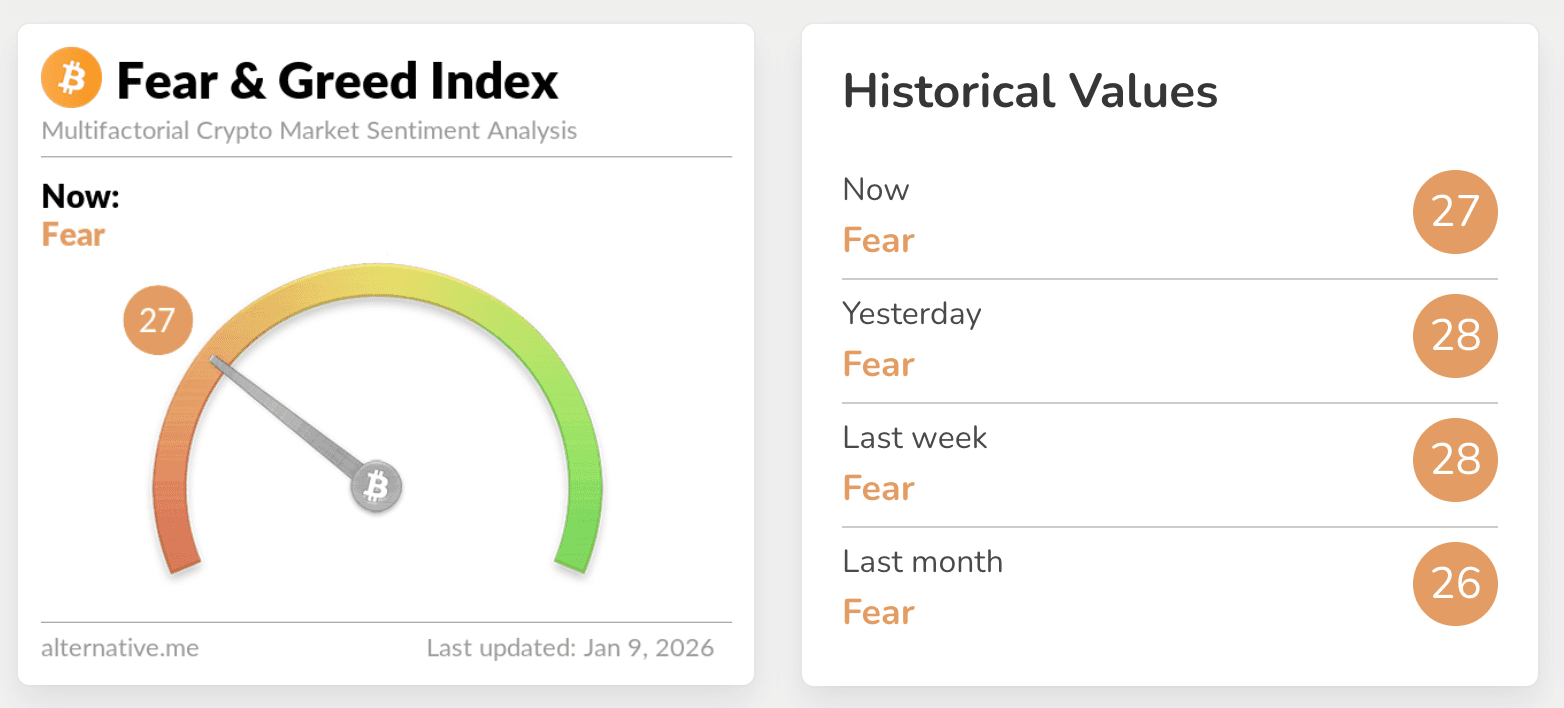 Sentiment remains cautious: the Crypto Fear & Greed Index finished the week at 27 (“Fear”), roughly unchanged from last week’s 28, suggesting risk appetite is improving only gradually.