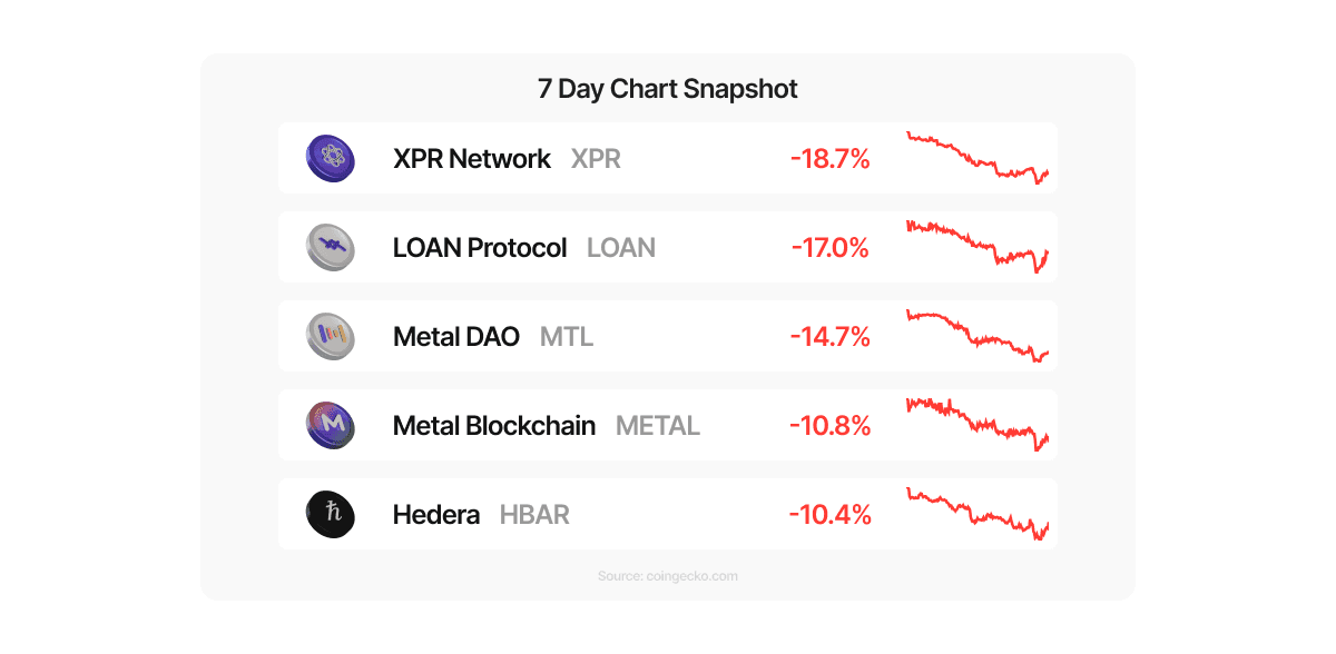 Selling pressure intensified across these coins over the past seven days, making them the sharpest downside movers on Metal Pay during the broader market pullback. XPR Network (XPR) led declines at -18.7%, followed closely by LOAN Protocol (LOAN) (-17.0%) and Metal DAO (MTL) (-14.7%), as smaller-cap and ecosystem-linked tokens saw outsized moves amid risk-off sentiment. Metal Blockchain (METAL) (-10.8%) and Hedera (HBAR) (-10.4%) also retraced meaningfully as liquidity thinned across altcoins. Historically, clusters of steep weekly drawdowns often coincide with elevated fear readings and forced de-risking, conditions that some investors view as potential entry points once volatility stabilizes and broader sentiment begins to recover.