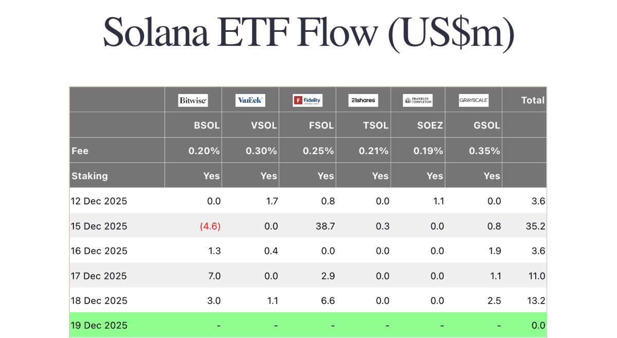 Monday (Dec. 15) saw Solana ETFs post a net +$35.2m, led by Fidelity’s FSOL (+$38.7m) while Bitwise’s BSOL recorded a -$4.6m outflow. Tuesday (Dec. 16) cooled to +$3.6m, supported by inflows into Grayscale’s GSOL (+$1.9m) and BSOL (+$1.3m) with smaller adds to VanEck’s VSOL (+$0.4m). Midweek, the strongest day was Thursday (Dec. 18) at +$13.2m as FSOL (+$6.6m) and BSOL (+$3.0m) led, supported by GSOL (+$2.5m) and VSOL (+$1.1m). Wednesday (Dec. 17) also remained constructive at +$11.0m, again led by BSOL (+$7.0m). Overall, SOL flows stayed positive through the week, suggesting steadier demand even as broader risk sentiment remained cautious.