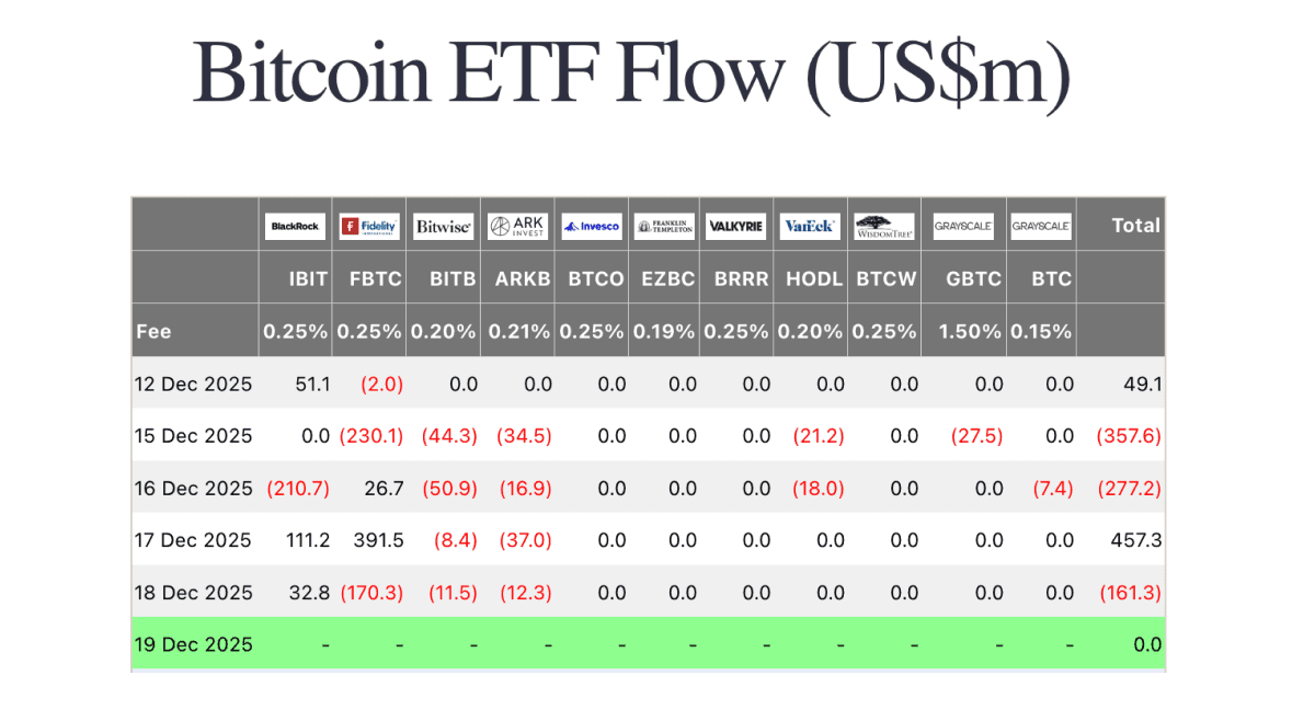 Monday (Dec. 15) saw bitcoin ETFs post a net -$357.6m, driven by heavy outflows from Fidelity’s FBTC (-$230.1m) alongside redemptions in Bitwise’s BITB (-$44.3m) and ARK’s ARKB (-$34.5m). Tuesday (Dec. 16) remained negative at -$277.2m, led by BlackRock’s IBIT (-$210.7m) and further selling in BITB (-$50.9m) and ARKB (-$16.9m). Midweek, the strongest day was Wednesday (Dec. 17) at +$457.3m as FBTC (+$391.5m) and IBIT (+$111.2m) outweighed modest outflows in ARKB (-$37.0m). Thursday (Dec. 18) slipped back to -$161.3m with FBTC (-$170.3m) the main drag despite small inflows to IBIT (+$32.8m). Overall, flows were volatile, with one major inflow day unable to fully offset large early-week redemptions.