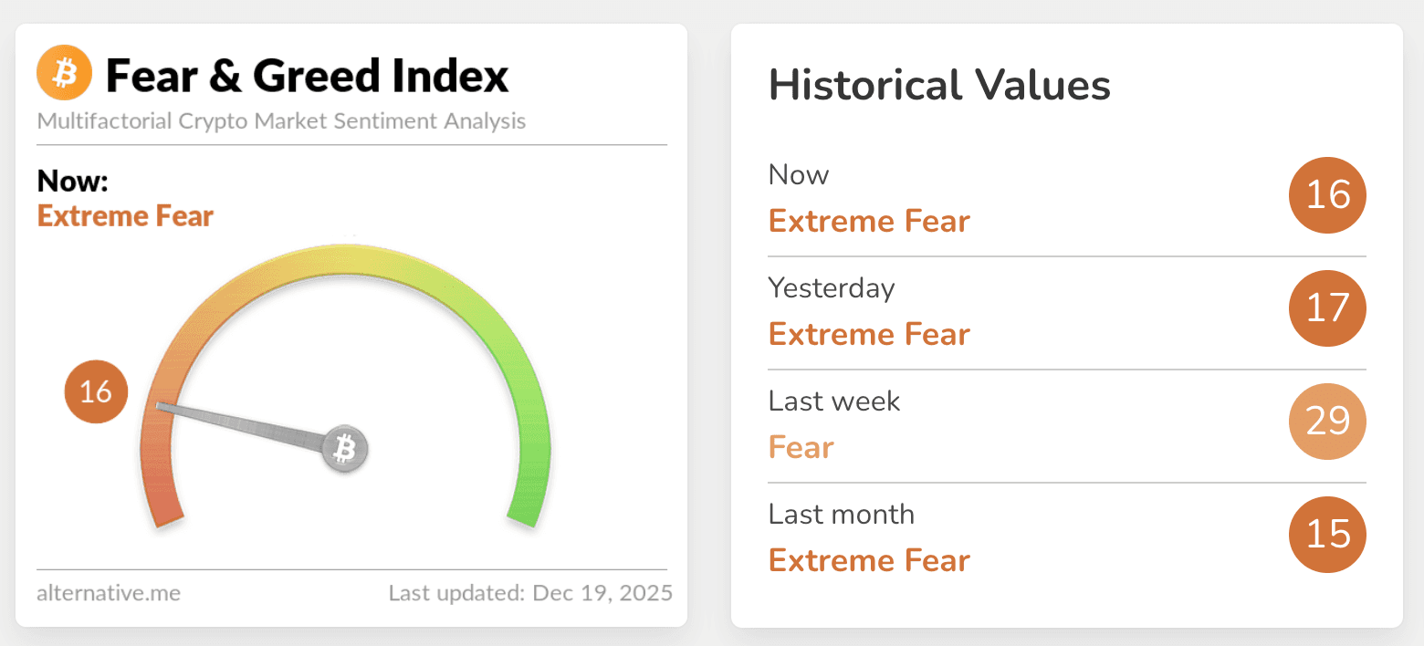 Crypto market sentiment deteriorated further into the end of the week, with the Crypto Fear & Greed Index falling to a reading of 16 on Friday, firmly in “Extreme Fear” territory. Data from Alternative.me showed the index slipping from 17 the prior day and well below last week’s reading of 29, highlighting how quickly confidence has eroded. Such low levels typically reflect widespread risk aversion, reduced leverage, and traders prioritizing capital preservation over new exposure. Historically, extended periods of extreme fear are associated with thin liquidity and heightened sensitivity to macro and policy headlines.