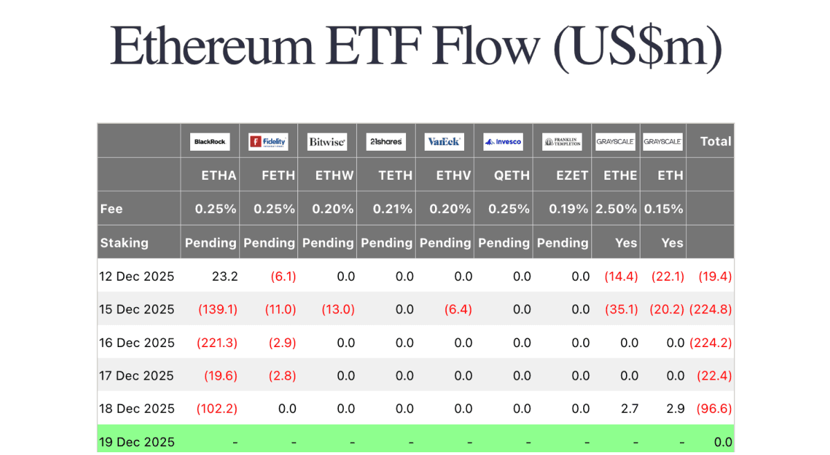Monday (Dec. 15) opened with ethereum ETFs at -$224.8m, led by BlackRock’s ETHA (-$139.1m) and sizable outflows from Grayscale’s ETHE (-$35.1m) and Grayscale’s ETH (-$20.2m). Tuesday (Dec. 16) was similarly weak at -$224.2m, almost entirely driven by ETHA (-$221.3m) plus smaller redemptions in Fidelity’s FETH (-$2.9m). Midweek, the least-bad day was Wednesday (Dec. 17) at -$22.4m, with losses concentrated in ETHA (-$19.6m) and FETH (-$2.8m). Thursday (Dec. 18) deteriorated again to -$96.6m as ETHA (-$102.2m) outflows were only partially offset by modest inflows to ETHE (+$2.7m) and ETH (+$2.9m). Overall, the week was defined by persistent ETHA-driven redemptions and consistently negative totals.